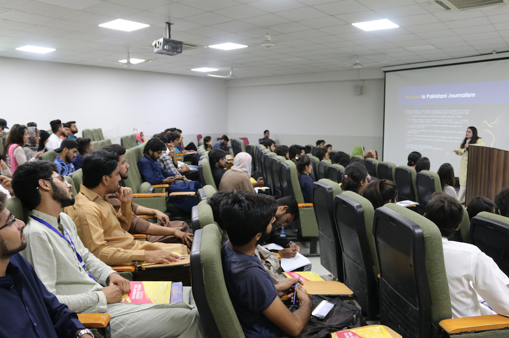 DRF held a session at University of Management and Technology with students of Media and Communication. Around 65 students attended the awareness raising session where they were encouraged to keep themselves secure online. In the second half of the session they were given digital security training and were also provided with CDs which included security toolkits and a guidebook on digital security.