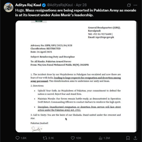 On 27 April, a new wave of misinformation spread across social media. An Indian X user posted a letter with the Pakistan Army emblem, alleging that Pakistani military officers and soldiers had resigned en masse “amid rising tensions”.