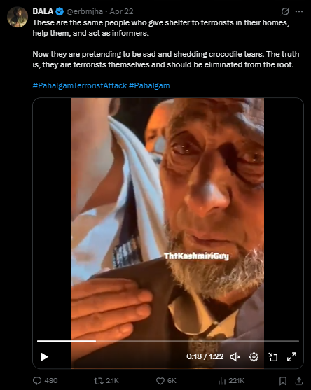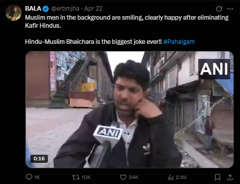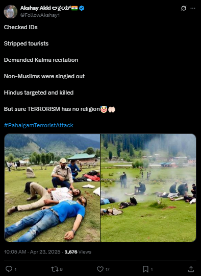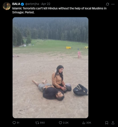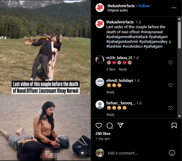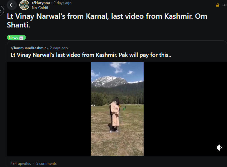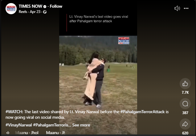 As the identities of the tourists came to light, one of the victims was identified as Indian Navy officer Lieutenant Vinay Narwal. A video of Lt. Narwal and his wife dancing in Kashmir on their honeymoon began to go viral, with captions such as “The last video shared by Lt. Vinay Narwal before the #PahalgamTerrorAttack”. These were shared by major Indian news outlets, such as Times Now.