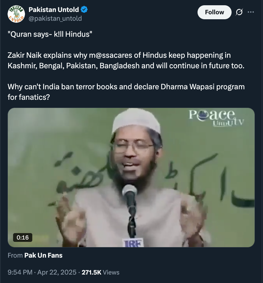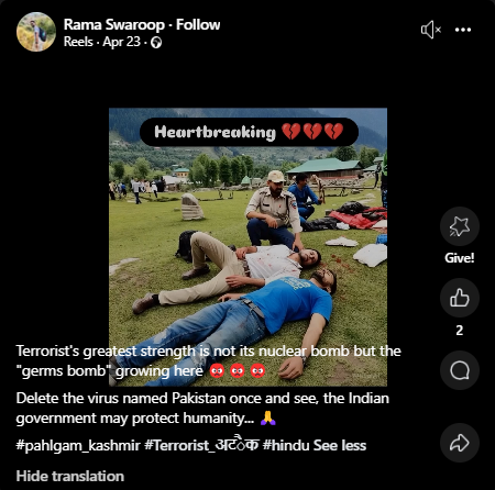 In this tense atmosphere, aiming to timely capture and report on the dangerous misinformation surrounding the Pahalgam attack, DRF analysed 72 unique posts by 52 unique users and media outlets across 6 social media platforms–X (formerly Twitter), Facebook, Instagram, Twitter, Reddit, and YouTube–and discovered instances of not only mass misinformation, but also hate speech, threats, and even genocidal intent, by a mix of Indian, Pakistani, and other users and media outlets.