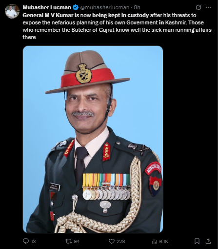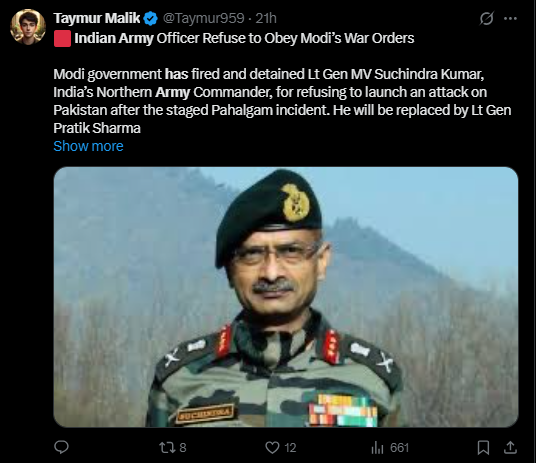 This piece of misinformation originated and spread in Pakistan between 29 and 30 April. Several Pakistani accounts on X, including Khara Sach anchorperson Mubasher Lucman’s, spread misinformation regarding the detainment and/or removal of the Indian Northern Commander Lt Gen Suchindra Kumar from his post following the Pahalgam attack.