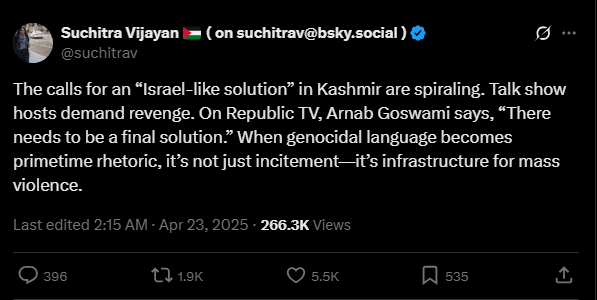 After the chaos that has been observed in online spaces in the fallout of the Pahalgam attack, it is clear that digital spaces can be just as volatile and dangerous as physical ones. If misinformation and hate speech continue to surge unchecked, inflammatory and potentially genocidal rhetoric will cost lives. There is an urgent need for ethical responsibility and accountability from platforms, policymakers, and users alike.
