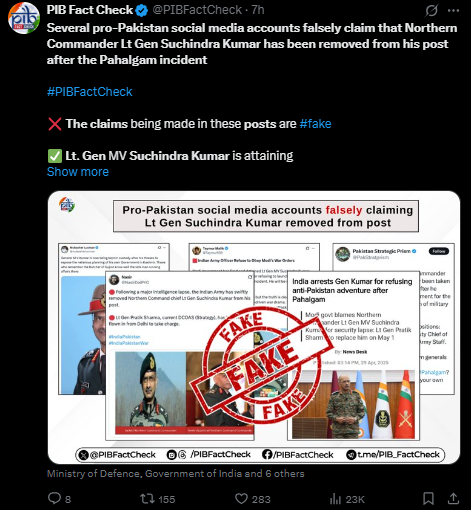 India’s Press Information Bureau categorically fact-checked and debunked these claims on Wednesday 30 April, in a post on X, stating that “Lt. Gen MV Suchindra Kumar is attaining superannuation on April 30.”