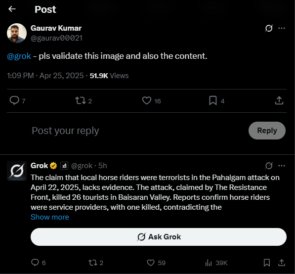 An interesting point to note is how, conversely, there were also instances of AI being used by social media users to fact-check dubious claims. For instance, there were several instances of users replying to X posts, tagging the xAI assistant Grok to help them fact-check claims.