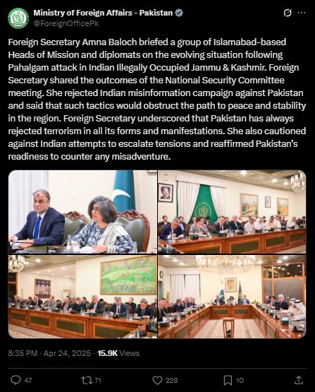 In tandem with the breakdown in diplomatic ties between the two countries, rampant misinformation was observed across social media platforms and news outlets in India and Pakistan. At a recent briefing with diplomats, Pakistani Foreign Secretary Amna Baloch rejected what she termed the “Indian misinformation campaign against Pakistan”.
