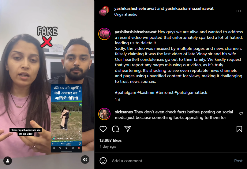 However, in a surprising turn of events, the next day, the couple from the dancing videos posted a video on their Instagram account clarifying that they were, indeed, not a victim of the Pahalgam attack, and were alive and well. The video was being shared as fake news by falsely linking it to the attack.