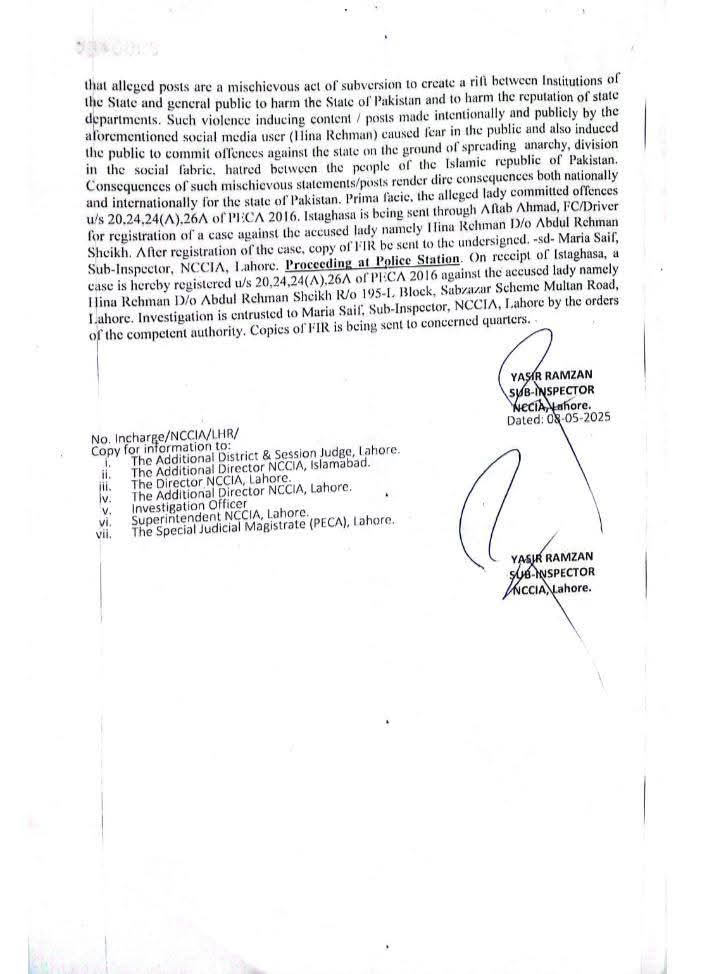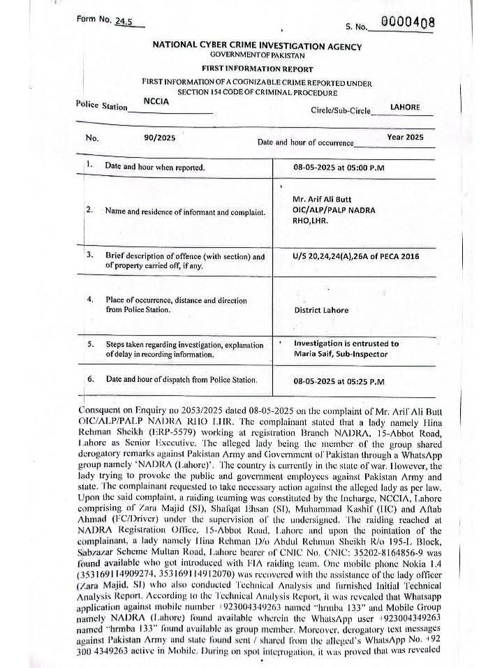 May 8, 2025A senior National Database & Registration Authority (NADRA) official in Lahore was arrested by the National Cyber Crime Investigation Agency (NCCIA) for allegedly sharing derogatory remarks about the Pakistan Army in a NADRA employees’ WhatsApp group. According to the First Information Report (FIR) filed that day, the accused (identified as Hina Rehman Sheikh, a senior executive at NADRA Lahore) had posted content deemed a “mischievous act of subversion” against the Army and the state. The FIR cites offences under Sections 20, 24, 24(A) and 26A of the Prevention of Electronic Crimes Act (PECA) 2016 in this case. Journalist Zahid Gishkori also confirmed the arrest on social media, reporting that a senior NADRA officer was detained for sharing an anti-Army remark via WhatsApp.