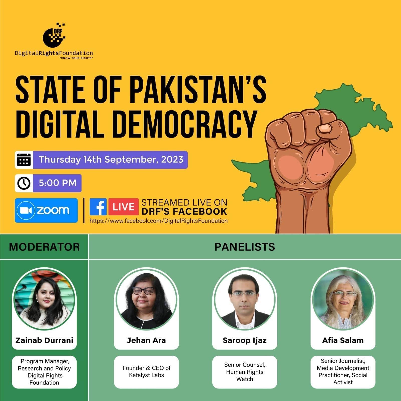 This year on the 14th of September, DRF hosted a webinar to commemorate the International Day of Democracy with legal, policy, media and human rights experts to discuss the latest developments in Pakistan that are undermining basic democratic freedoms, especially in the context of internet rights.