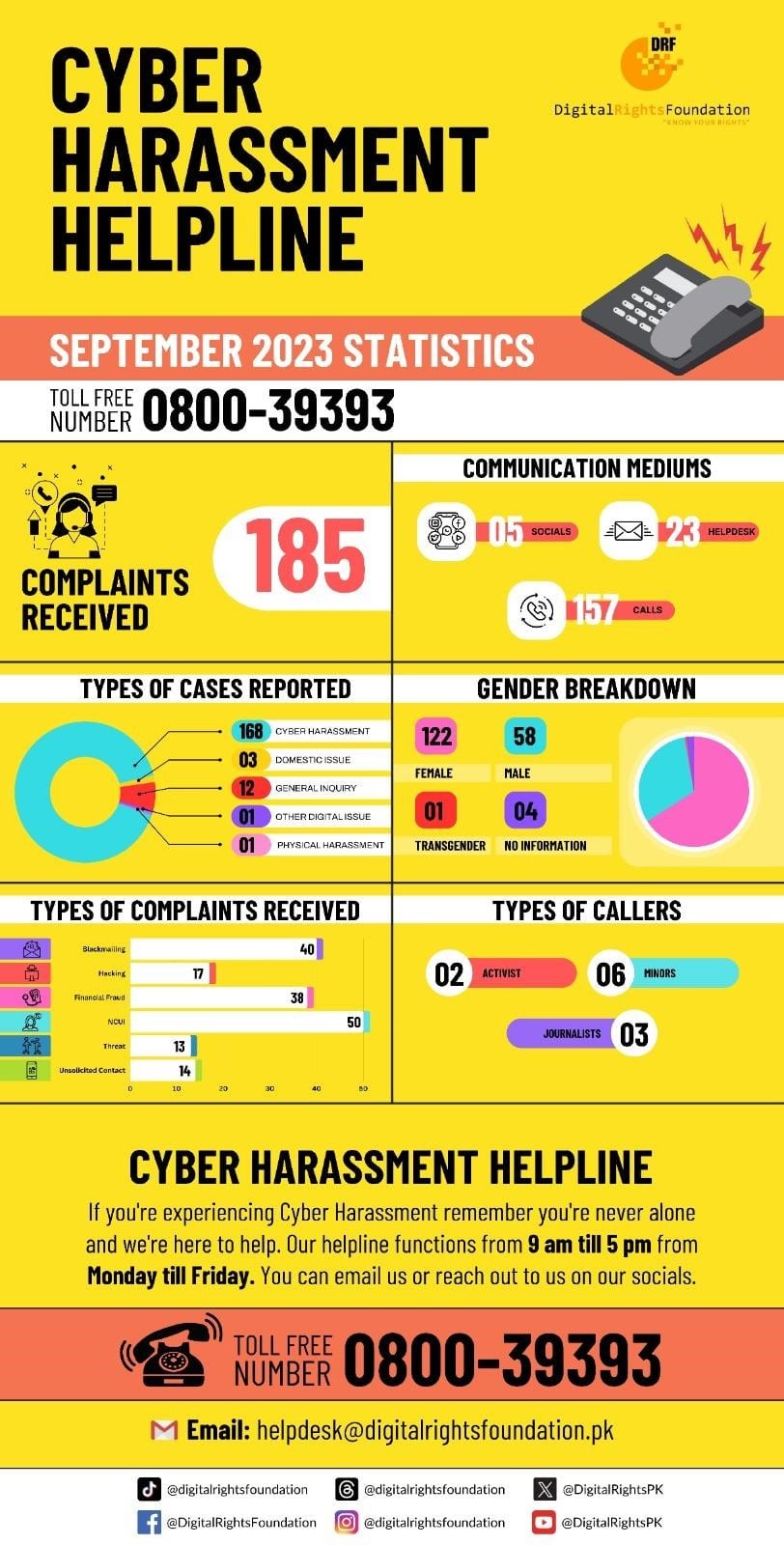 The Cyber Harassment Helpline received 185 complaints in total September, with 122 complaints by women. If you’re encountering a problem online, you can reach out to our helpline at 0800-39393, email us at helpdesk@digitalrightsfoundation.pk or reach out to us on our social media accounts.