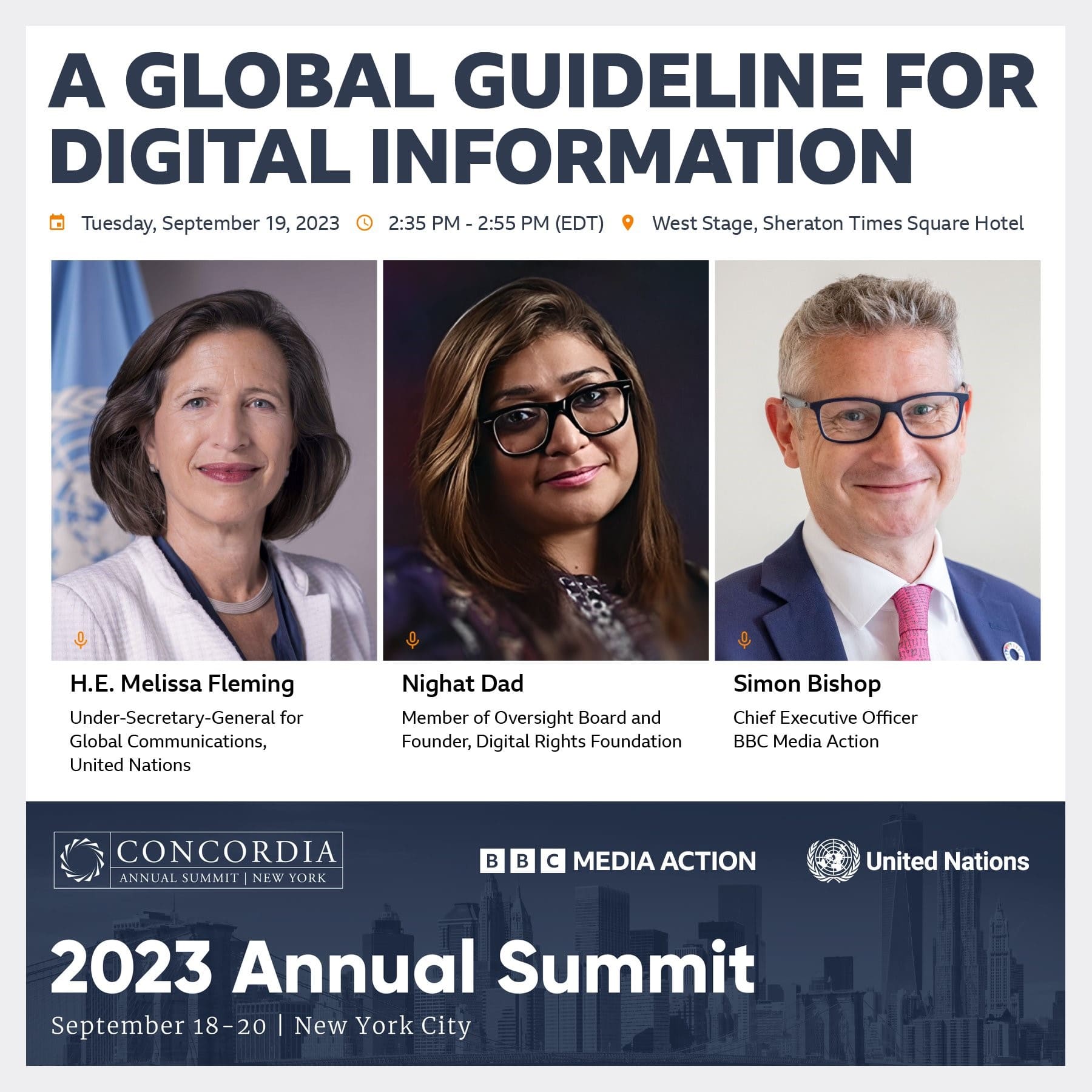 Nighat Dad, Executive Director of DRF, spoke at the Global Guideline for Digital Information event on 19th September during the 13th session of the Concordia Annual Summit, a leading public-private sector forum held alongside the UN General Assembly. Nighat spoke about examining how misinformation threatens democracy and development and what can be done to address it.