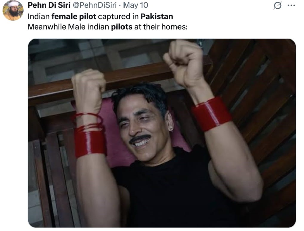 Sexism and misogyny-driven humor and memes were propagated by Pakistanis on social media as well. As soon as the name of Operation Sindhoor was revealed, Pakistanis made sexist jokes around consummating the marriage and/or making these wives widows. When fake news about the capture of a female Indian pilot spread on social media, sexist jokes were made about the appearance of the pilot and stereotypical gender roles. A social media post said that after capturing a male pilot who was served tea, Pakistan has now captured a pilot who will make the tea.