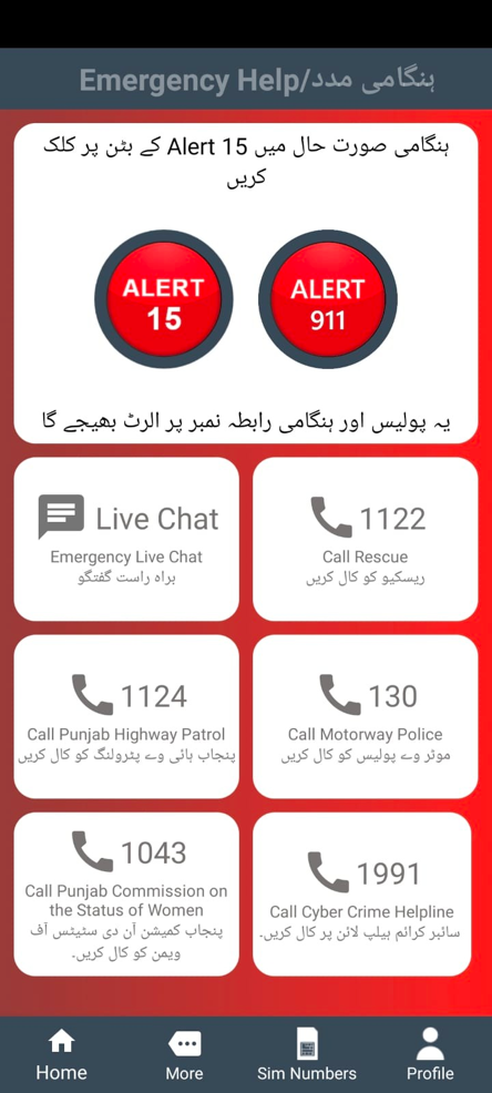 The application has two alert buttons: one for dialing Punjab police helpline 15, and the other for national helpline 911. The app also includes a live chat feature and contact numbers for rescue services, the Punjab Highway Patrol, the Motorway Police, the Punjab Commission on the Status of Women, and the Cyber Crime Helpline.